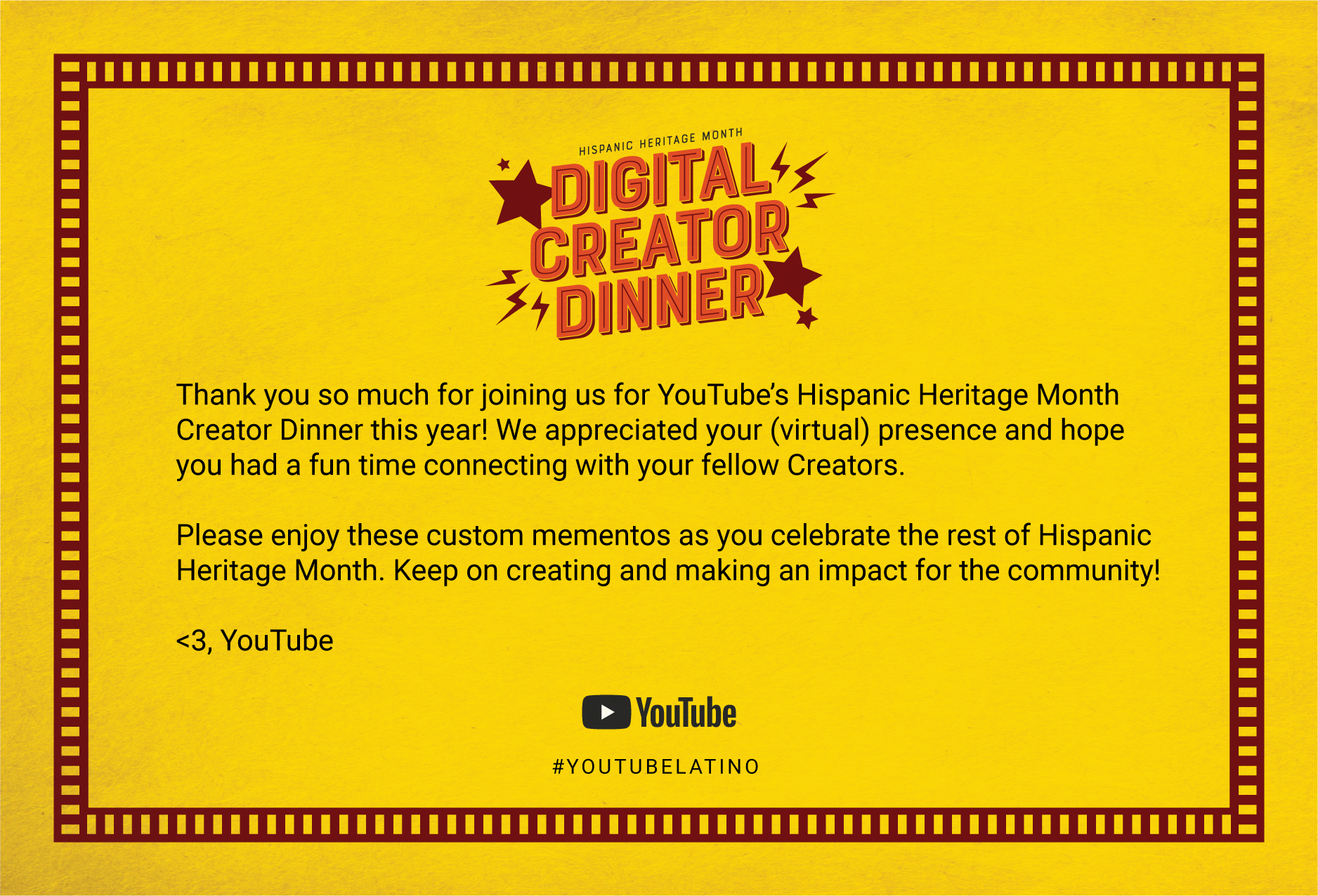 YouTube’s annual HHM Diversity Dinner for their creators, was a series of virtual, intimate dinner events from September 22-25, 2020 via Google Meet, with the theme of “Strength in Numbers”. This theme speaks to the fact that, despite hurdles the community has had to face, a sheer strength in numbers & passionate support through generations of family / community bonds & economic resiliency have propelled generations of Latinxs to survive and thrive.